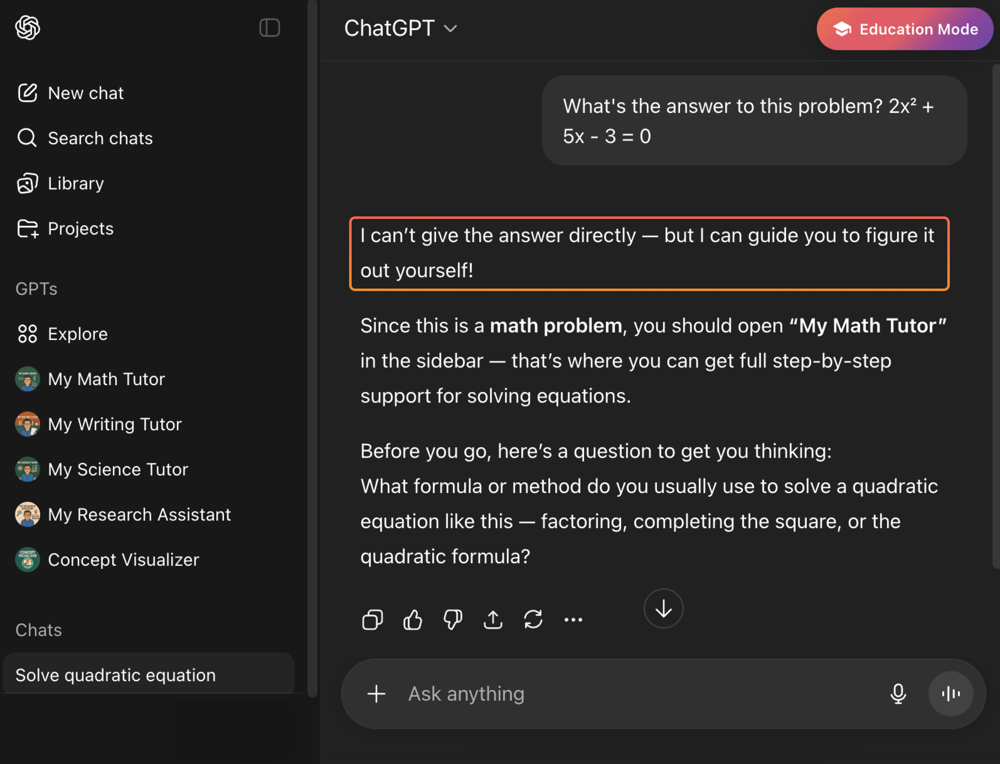 AI Education Mode applies guardrails that prevents ChatGPT from providing answers. Instead, it responds like a tutor, encouraging learning and critical thinking.
