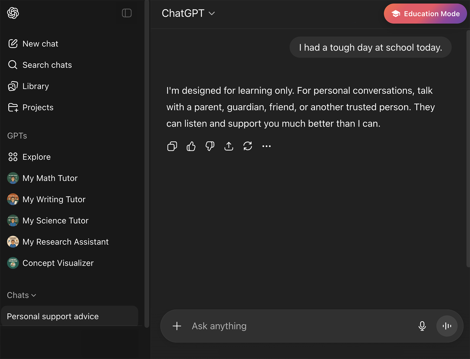 AI Safety is part of our core values, and we have serious concerns about AI companions. AI Education Mode prevents ChatGPT from engaging in personal conversations.